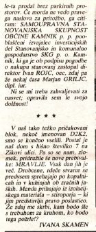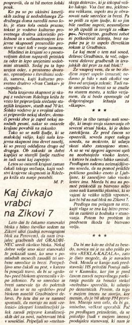 »Ko gradbeni ropot ne poškoduje zelenja, uspe pa to človeškim rokam iz Gradbinca«, beremo v 22. številki Kamniškega občana. Trud in želja stanovalcev Zikove ulice 7 po zeleni okolici svojega bloka je bila tako poteptana. Beremo še o težavi, ki jo stanovalcem severnih stanovanj bloka povzroča vlaga in »neiznajdljivosti« soseda pri reševanju te težave. Ne manjka dobrohotni nasvet Ivane Skamen sosedom, ki so za brisalci svojega avtomobila prejeli tisti ‘zoprni’ listek. In to še ni vse. Na Zikovi 7 so se naselile tudi »prebivalke«, predrzne stanovalke, ki so radovedno vstopale, se sprehajale in se nepovabljene prehranjevale prav v vsakem domu. Joj, res bogi so bili »vrabčki« na Zikovi ulici 7 v letu 1987.