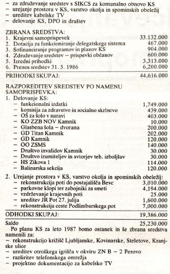 Samoprispevek 1987. Iz 17. številke Kamniškega občana. Samoprispevek v krajevni skupnosti Perovo je bil uveden s 1.6.1986 po stopnji 1,5% z naslednjo namembnostjo: